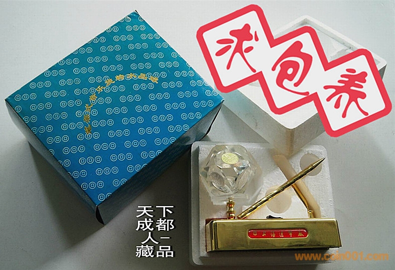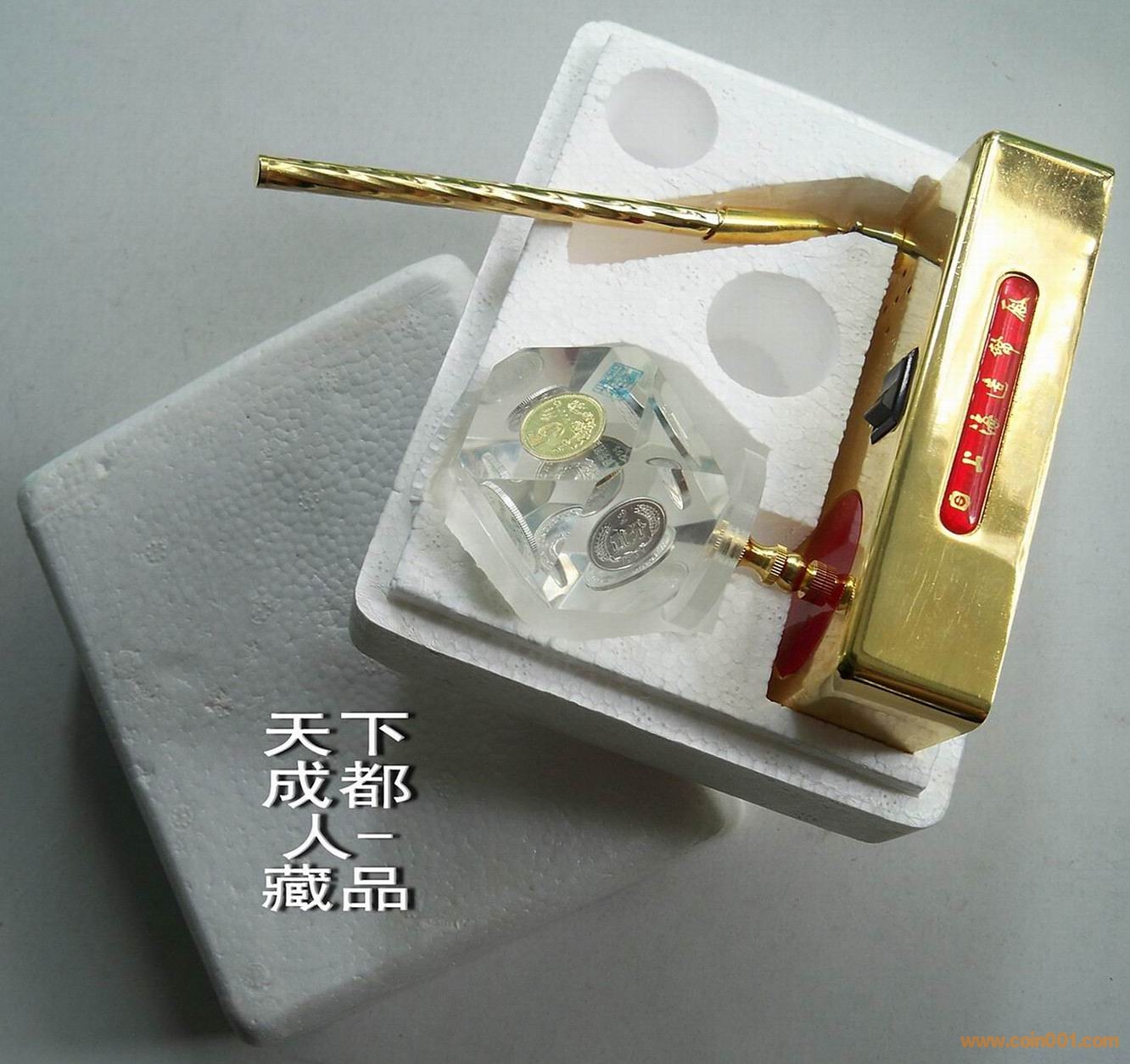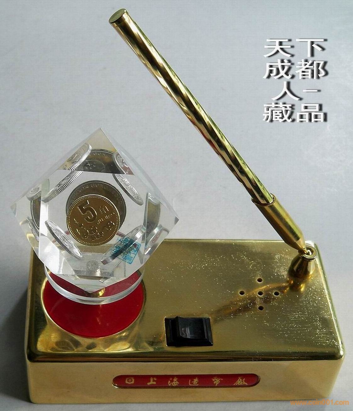 另類趣味、硬幣水晶座:早期上海造幣廠精工制作《筆架式“老三花”牡丹系列硬幣音樂(lè)旋轉(zhuǎn)水晶球架》原盒水晶球6枚硬幣;水晶體鑲嵌95版牡丹壹元、伍角、93版菊花壹角、86年伍分、87年貳分和91年壹分各1枚;筆架式材質(zhì)鋼質(zhì)鍍金、底坐長(zhǎng)寬14.8*3.5毫米、旋轉(zhuǎn)音樂(lè)水晶球造型、側(cè)面鑲嵌“上海造幣廠“字樣”,配置一支鍍金簽字筆(如用,可更換筆蕊)。
