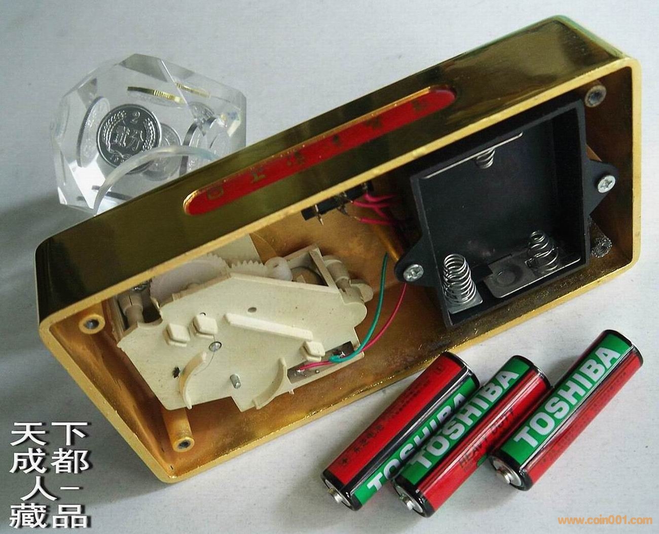 水晶底座可將4螺帽拆開(kāi)放置三節(jié)5號(hào)電池(自行配置),打開(kāi)開(kāi)關(guān)可自行電動(dòng)旋轉(zhuǎn)其水晶球,可播放懷舊音樂(lè)等歌曲。原外紙盒內(nèi)置泡沫精美包裝、各幣無(wú)氧化或黑斑、該水晶球體內(nèi)均鑲小塑料卡“上海造幣廠”標(biāo)識(shí)。