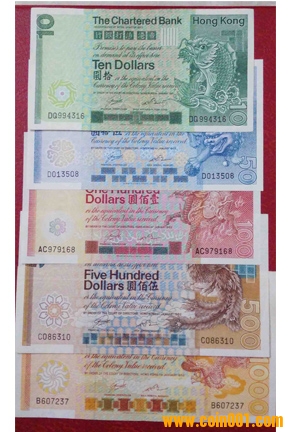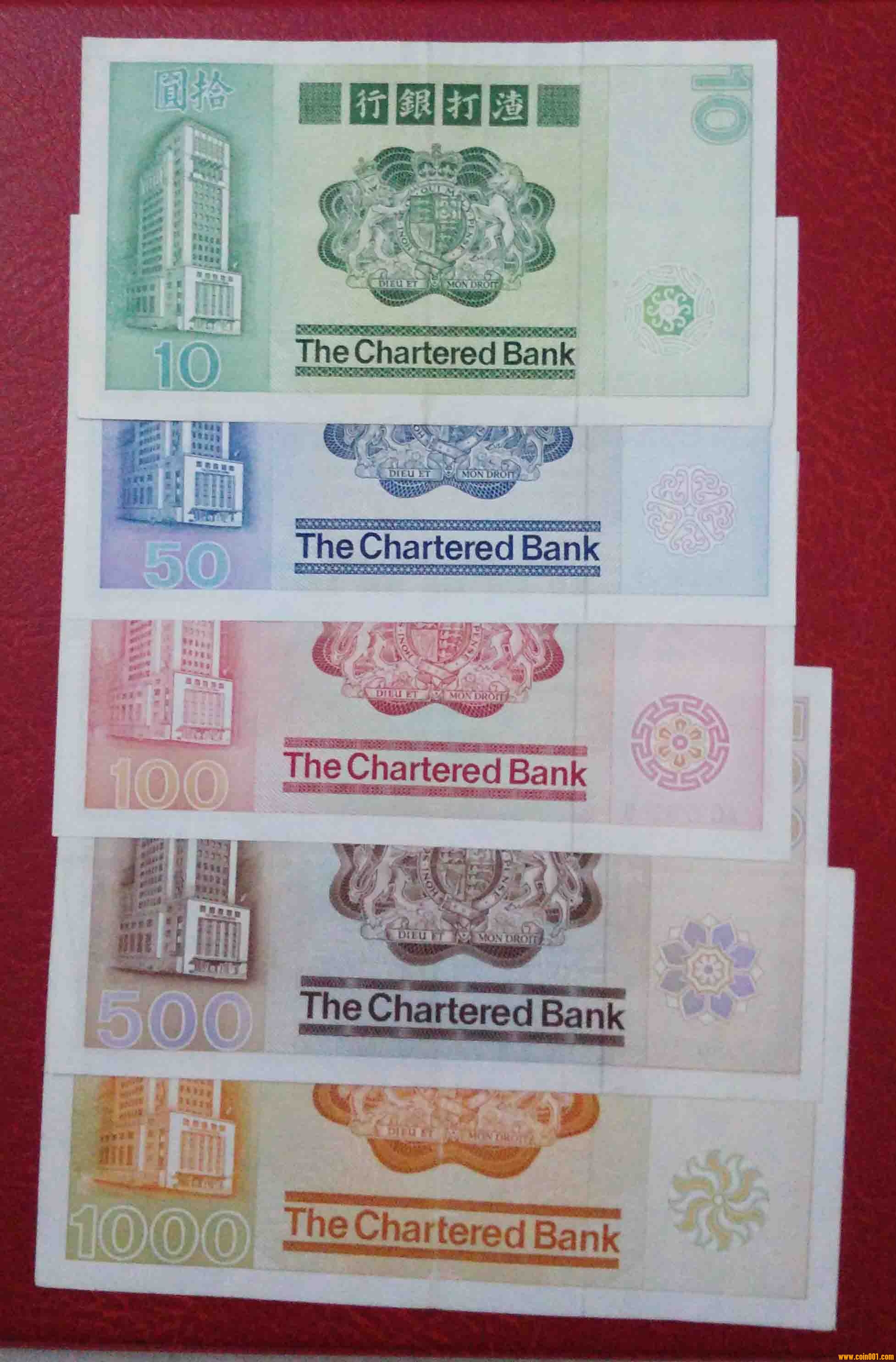 圖片:香港渣打銀行,五色紙,全品,1982年壹仟B607237,1982年伍佰C086310,1982年壹佰AC979168,1982年伍拾D013508,1981年拾圓DQ994316(1,.jpg