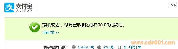 引用 引用第23樓kfc2012于2015-10-23 17:53發(fā)表的 :不好意思轉(zhuǎn)錢重復(fù)了。轉(zhuǎn)了兩次300元。請姚總確認(rèn)并退回一筆。謝謝