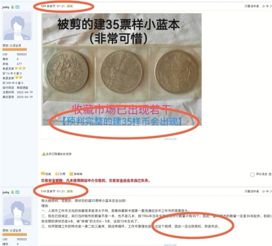 鑒于建35樣幣的龍頭地位以及巨大的價(jià)值表現(xiàn),今后錢幣交易市場(chǎng)肯定會(huì)再出現(xiàn),不可能一直停留在已露面的4套數(shù)量上(見(jiàn)論壇截屏),現(xiàn)在果然出現(xiàn)了第5本。