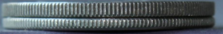 ??????早期銅鎳合金精制幣與普制幣的幣邊有區(qū)別,精制幣都是直角邊,普制幣是圓弧邊,以前的理論認(rèn)為,圓弧邊是倒角所致,精制幣幣邊不倒角。(見下圖)