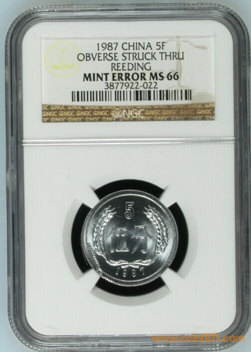 錯幣標簽,鑄幣過程中邊齒壓印到了幣面上,錯誤描述為“obverse struck thru reeding”,此種錯誤極少見。