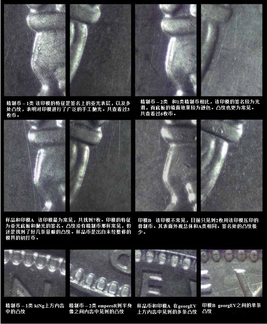 盡管該幣的發(fā)行量很低,但是生產(chǎn)普制幣時(shí)至少使用了兩副印模。這兩副模具在圖6和圖7中作了說(shuō)明。進(jìn)一步的研究可能會(huì)發(fā)現(xiàn)更多印模。樣品幣的印模在去除了乳頭后被重新投入使用(作為印模A)。在本作者觀察的普制幣中,該印模壓印的幣占了大多數(shù)。