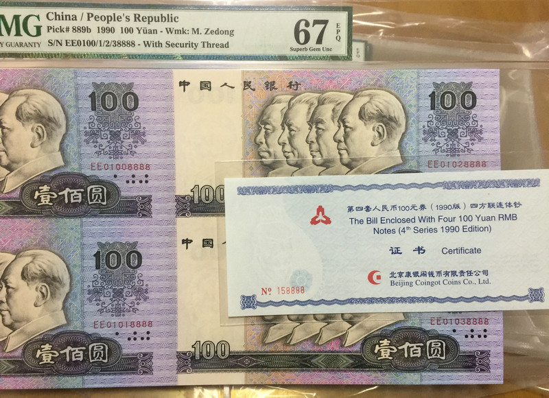10拍 0元起拍 連體鈔 90100四連體 PMG 66分 90100是2004年發(fā)行的 屬于是較早期的連體鈔!