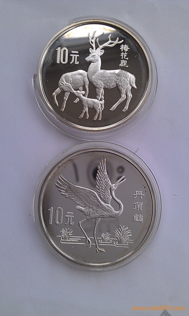 出1989年珍稀動(dòng)物第二組(丹頂鶴 梅花鹿)一套2枚精制銀幣 實(shí)鑄量10005枚