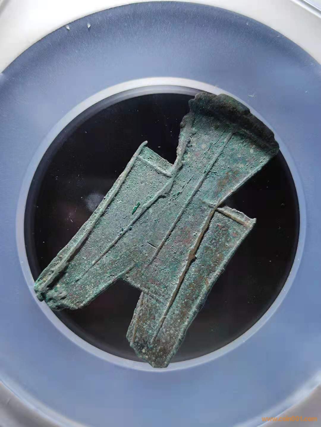 生坑薄綠銹入骨十分,錢文挺拔高聳有力,筋線完好略有移范。從澆口、邊線毛刺存留,超高的尺寸數(shù)據(jù),可窺探無流通之筋骨,銹色透出京坑之精氣神。據(jù)考“露”為戰(zhàn)國時(shí)期古地名,即今山西省長治市潞城縣境內(nèi)東北。戰(zhàn)國初此處屬晉國,后被趙、魏、韓三分晉地,戰(zhàn)亂紛爭群雄爭霸,“露”曾被趙國和韓國幾經(jīng)易手,故其鑄造歸屬是趙還是韓,無直接確鑿證據(jù)予以確定。此品為方足布少見項(xiàng),存世字口普遍模糊,形態(tài)絕佳者則寥寥無幾。