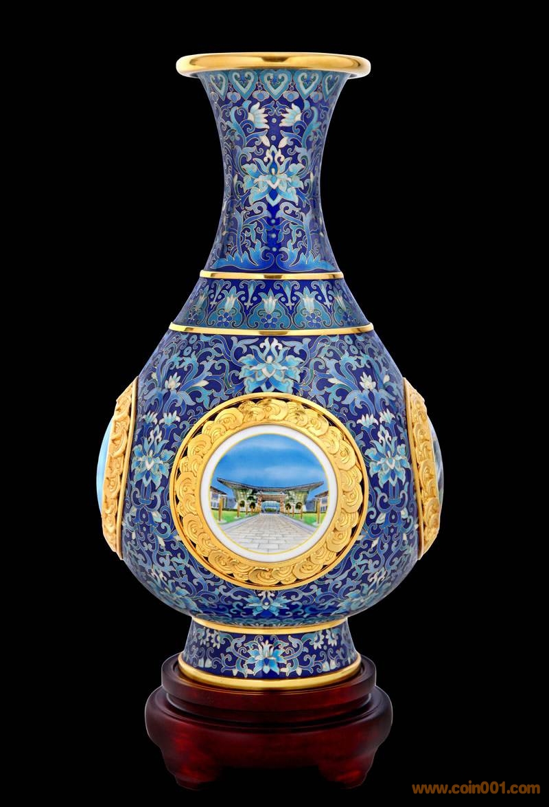 《四海升平》景泰藍(lán)賞瓶瓶身38厘米高,為天壇祈年殿38米身高的等比例縮小。賞瓶最大直徑21厘米,代表APEC的21個(gè)成員。器型四面開光,周圍以浮雕吉祥水紋環(huán)繞,象征“四海”,寓意太平洋,“瓶”即“平”,整體即四海升平。開光部分正面為本屆APEC會(huì)議標(biāo)志,背面為北京雁棲湖APEC主會(huì)場,兩側(cè)分別為北京標(biāo)志性建筑天壇和懷柔慕田峪長城。根據(jù)國際慣例,歷年度亞太經(jīng)合組織會(huì)議的東道主領(lǐng)導(dǎo)人及配偶,都要為參加APEC的各成員領(lǐng)導(dǎo)人及配偶,贈(zèng)送體現(xiàn)本地歷史文化或自然風(fēng)貌的特色紀(jì)念禮品。《四海升平》景泰藍(lán)賞瓶典藏版作為APEC國禮運(yùn)營,全球限量發(fā)行、具有極高的藝術(shù)性、鑒賞性和收藏性。
