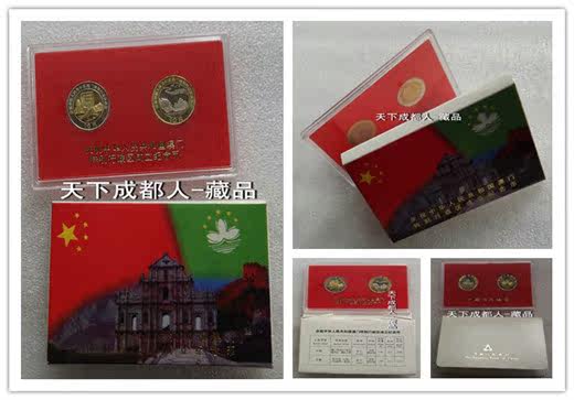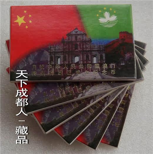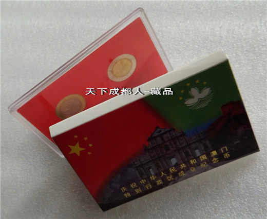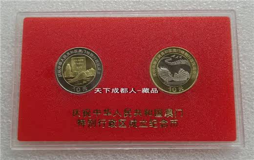 《慶祝中華人民共和國(guó)澳門特別行政區(qū)成立(雙色)紀(jì)念套幣塑盒》原外紙?zhí)?幣裝;盒內(nèi)套幣材質(zhì)銅合金雙色鑲嵌 、各幣面值均為10元、直徑25.5毫米,每枚重量7.8克、發(fā)行量400萬(wàn)套,