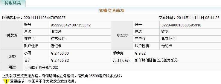 引用 引用第38樓心系長城幣于2011-11-11 08:58發(fā)表的 :已匯款購2套小五套全同號紙幣(6枚裝),號碼為[/b]19890817/19890723號碼不能搞錯!保證紙幣全新無折無污。貨發(fā)簽名檔。合作愉快!