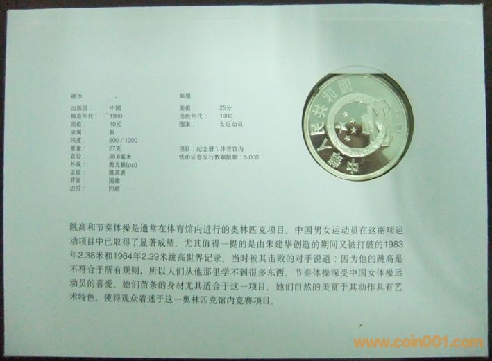 中國1992年國際奧林匹克運(yùn)動(dòng)會(huì)跳高10元精制紀(jì)念銀幣封2枚 800元