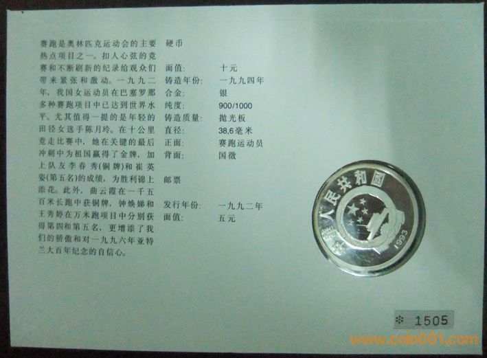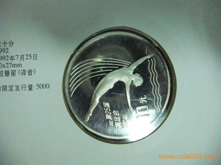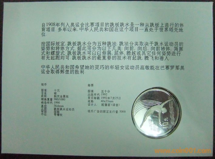中國1992年國際奧林匹克運(yùn)動(dòng)會(huì)跳水10元精制紀(jì)念銀幣封 800元