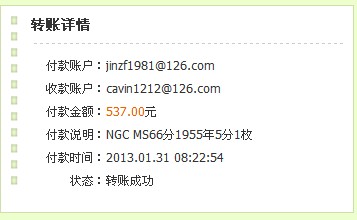 引用 引用第21樓kithang于2013-01-30 23:35發(fā)表的 : 曹兄請(qǐng)確認(rèn)中拍一枚771MS66及一枚781MS65款152兄+160元(再加40元順豐到香港簽名欄地址)共352元已打工行序號(hào)HQH000000000002003324725請(qǐng)查核及見(jiàn)短信謝謝!