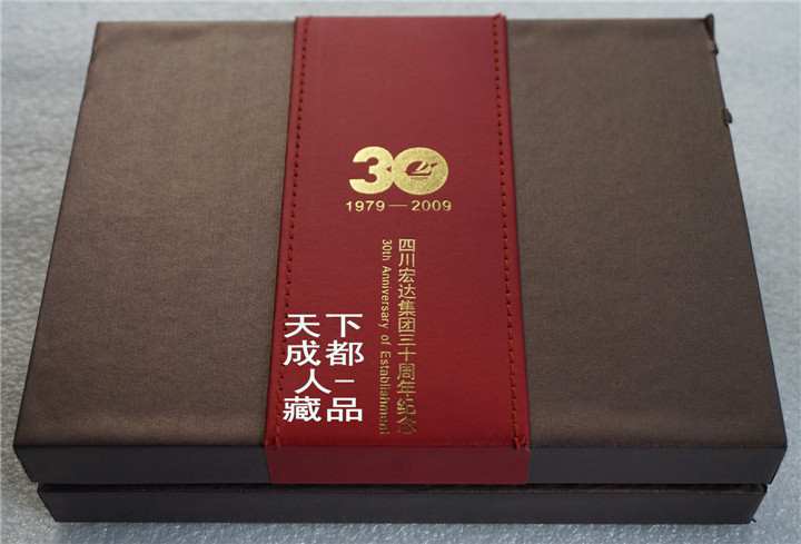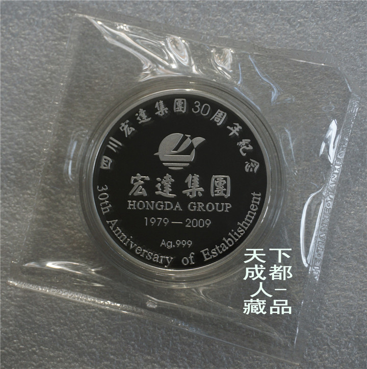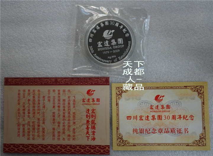 2009年四川宏達(dá)集團(tuán)監(jiān)制、成都天和銀樓公司定制《四川宏達(dá)集團(tuán)三十周年(精制)100克純銀紀(jì)念章》原禮盒1枚紀(jì)念章裝;該紀(jì)念章材質(zhì)純銀、重量100克、成色99.9%、直徑65毫米,精制帶齒邊鑄造工藝,鑄造量不詳。原禮盒精美包裝,隨附該集團(tuán)簡(jiǎn)介、品質(zhì)證書各1張,以資紀(jì)念。