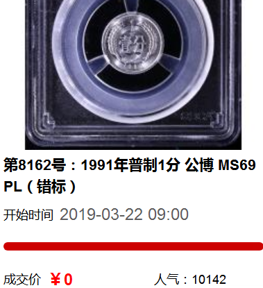 敬請關(guān)注2019年春秋大拍拍品第8162號:1991年普制1分 公博 MS69PL(錯標)