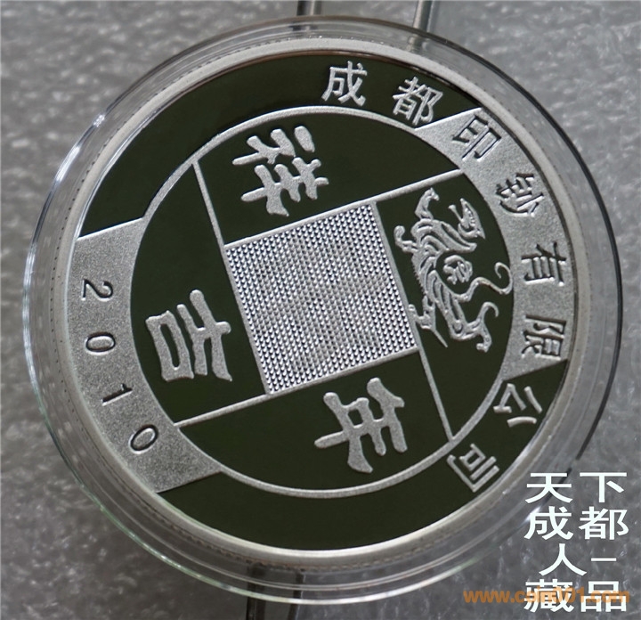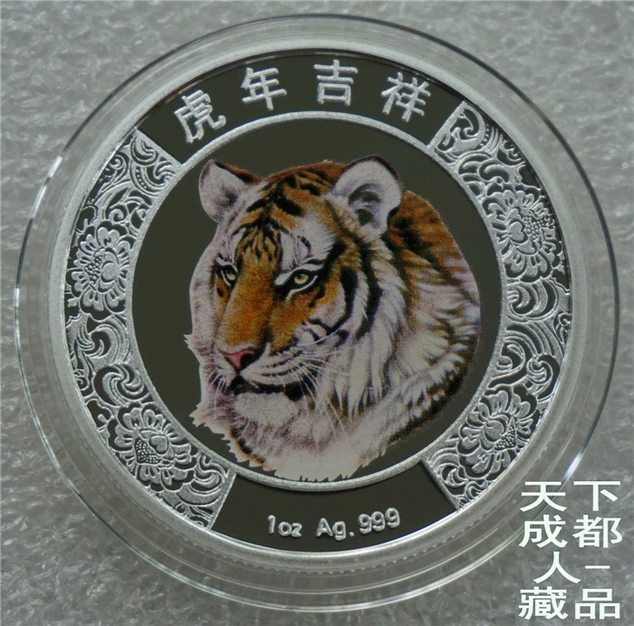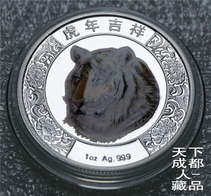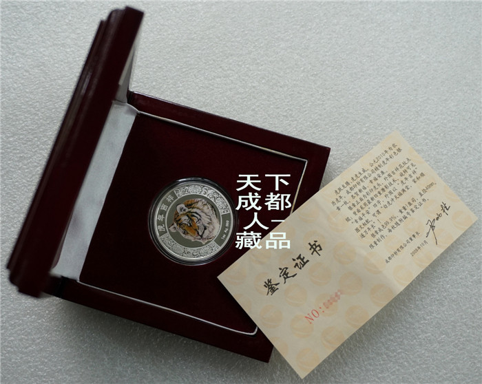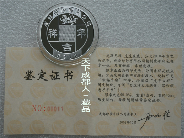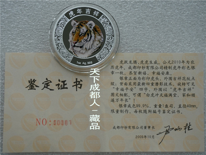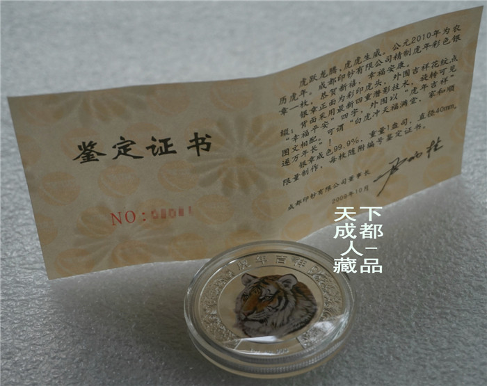 四重潛影工藝、生肖彩色銀章:中國印鈔造幣總公司成都印鈔公司鑄造《2010年生肖虎(精制雙色)潛影彩銀紀(jì)念章》原盒證1枚裝;材質(zhì)純銀、雙色彩色精制帶齒邊工藝,采用四重潛影防偽技術(shù)幣形鑄造工藝、重量一盎司、成色99.9%、直徑40毫米、限量發(fā)行。成鈔司原木盒內(nèi)精美包裝,隨附帶編號含水印鑒定證書1份。