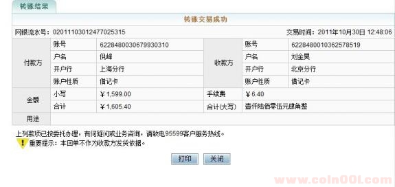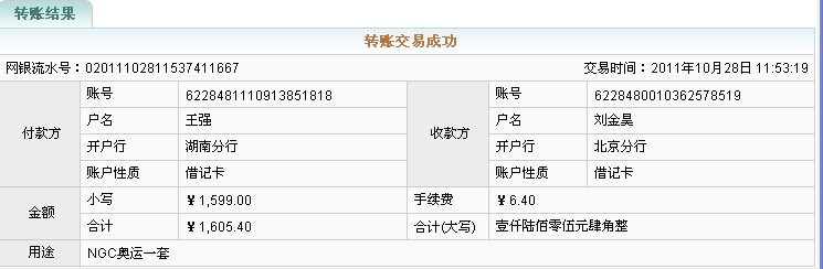 轉(zhuǎn)賬結(jié)果轉(zhuǎn)賬交易成功 交易時(shí)間:2011年10月27日 15:35:19 網(wǎng)銀流水號:02011102715357831895