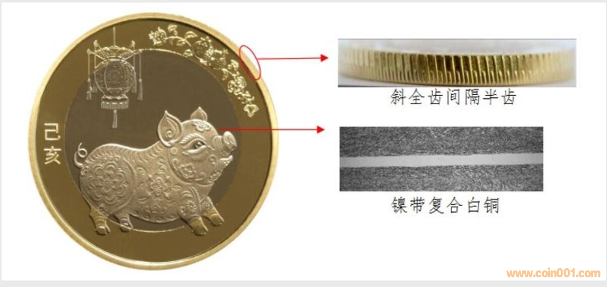 硬幣外環(huán)為黃色銅合金,內(nèi)芯為具有獨特機讀性能的鎳帶復合白銅材料。