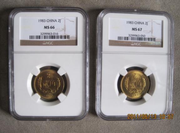 6:1983年2角硬幣.67分的2600元.66分的2200元.串號分別是3299963-050 3299963-016.