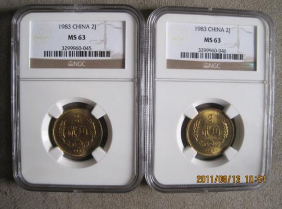 8:1983年2角硬幣63幣的999元(有兩枚).串號為3299960-046.3299960-045.評63分當然有品相問題.