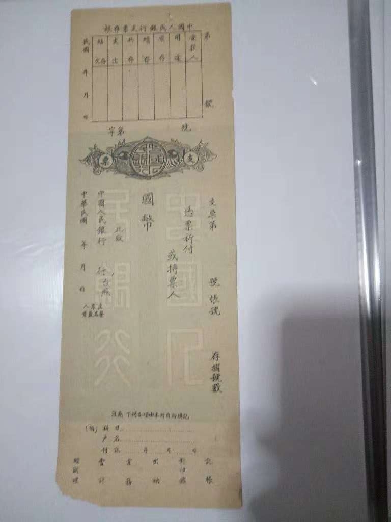 人行成立后、中央暫以華北人民銀行為中國(guó)人民銀行的總行,各地方銀行轉(zhuǎn)為中國(guó)人民銀行的分行,但各地方銀行仍歸各解放區(qū)自己領(lǐng)導(dǎo),進(jìn)行原來(lái)業(yè)務(wù)。所以在人行剛成立時(shí)、各解放區(qū)銀行并沒(méi)有在第一天就統(tǒng)一使用中國(guó)人民銀行字樣的銀行票據(jù)、而是沿用原來(lái)的老單據(jù)、有的甚至用到新中國(guó)成立。人行各區(qū)行、分行、支行正式成立后、銀行票據(jù)開(kāi)始多采用人民券、后用人民幣,貨幣符號(hào)$。1951年根據(jù)《中央人民政府政務(wù)院政秘字第三七六號(hào)通知》:“一、‘元’之英譯名統(tǒng)譯作(YUAN)。二、符號(hào)統(tǒng)一規(guī)定為‘¥’?!?、人行將貨幣符號(hào)改為¥、即人民幣和¥。但山西省分行和河北省分行仍沿用老叫法、即人民券和¥。