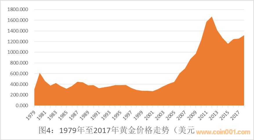 以貴金屬為載體,是我國貴金屬幣的最重要特點,也是區(qū)別于其它工藝或藝術(shù)類收藏品的主要差異點之一。人們選擇購買現(xiàn)代貴金屬幣的主要動機,一方面是它們本身具有文化藝術(shù)價值,同時也是看重其中的貴金屬商品屬性。以下的圖4和圖5分別是1979年至2017年黃金和白銀的價格走勢。