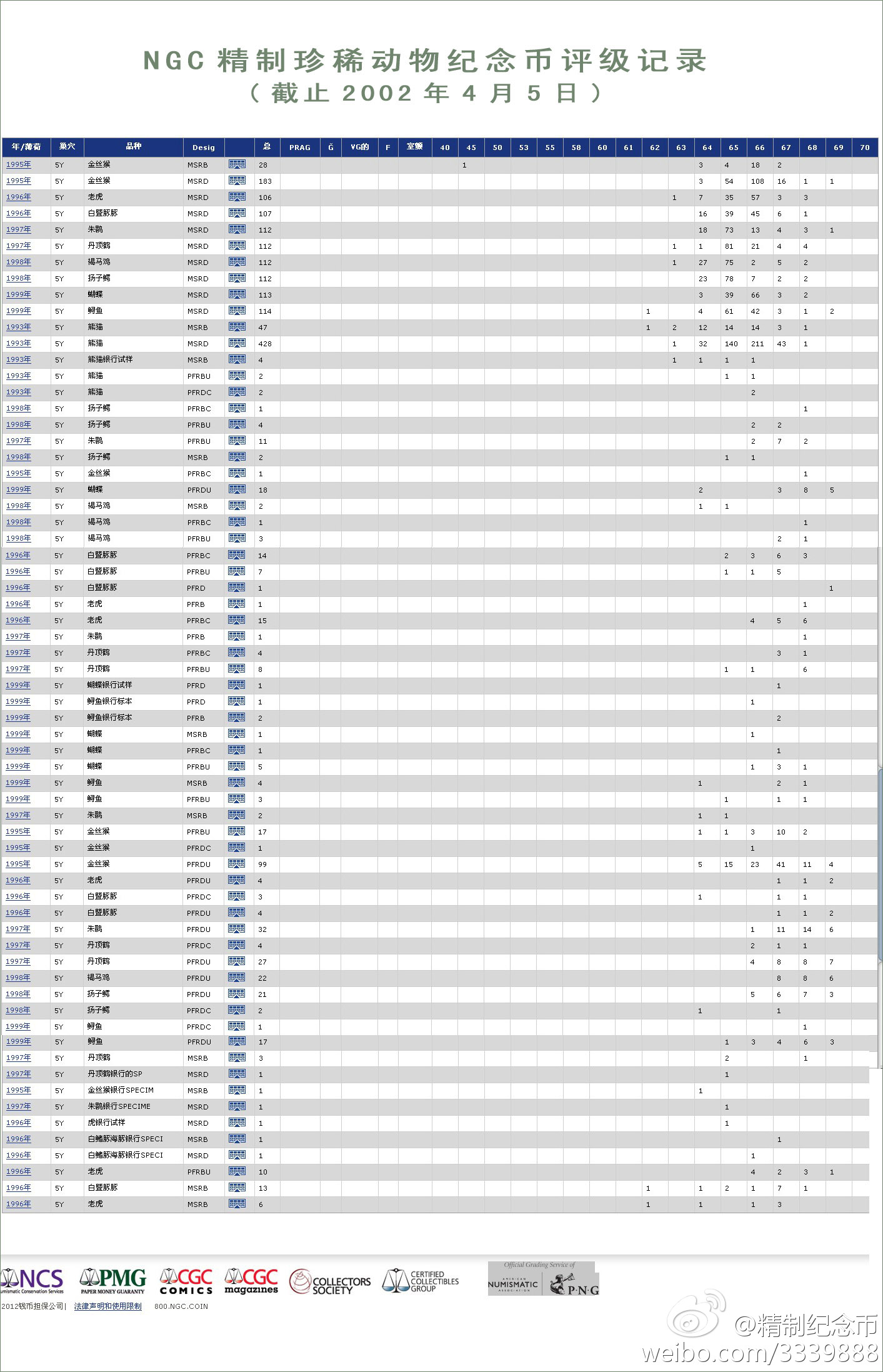 附:NGC精制珍稀動物紀念幣評級記錄(截止2012年4月5日)