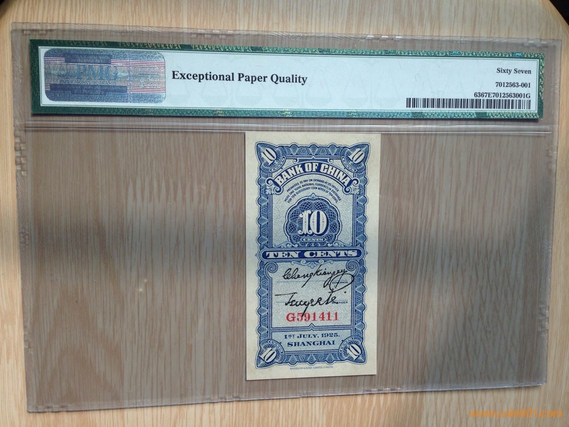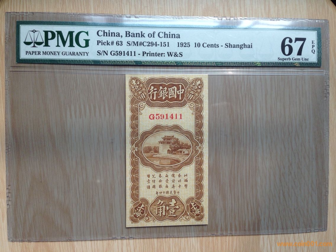 加一枚:稀少絕品民國14年中行豎版一角 PMG67EPQ (冠軍分),價(jià)格2500 包申通。