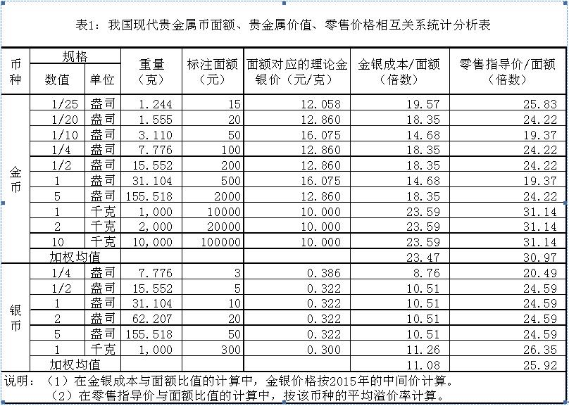 如表1所示,在央行發(fā)行的“貴金屬幣”中,金幣面額對應(yīng)的金價在10.000~16.078元/克之間,銀幣面額對應(yīng)的銀價在0.30~0.39元/克之間。從貴金屬價格的發(fā)展趨勢看,恐怕再也不可能回落到這樣的金銀價格。如按2015年平均的金銀價格計算,黃金價值是金幣面額的14.68~23.59倍,加權(quán)均值為23.47倍;白銀價值是銀幣面額的8.76~11.26倍,加權(quán)均值為11.08倍。與此同時,在這些“貴金屬幣”面對公眾發(fā)售時,均有一定的加工成本和利潤。按金銀幣的零售指導(dǎo)價與面額之間的平均比價關(guān)系計算,金幣的加權(quán)均值為30.97倍,銀幣的加權(quán)均值為25.92倍。實際上金銀價值和零售指導(dǎo)價與面額之間的比值關(guān)系是一組動態(tài)數(shù)據(jù),它們將隨零售指導(dǎo)價定價原則和貴金屬價格的變化而變動。