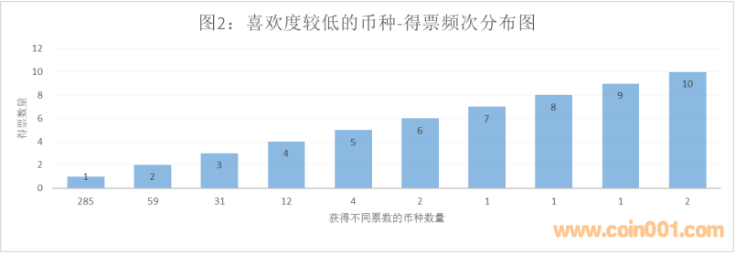 ??????2.參加評選喜歡度較低幣種的投票次數(shù)620次,參與人數(shù)214人,平均人數(shù)206人。被評選的幣種共計398枚,其中有2個幣種受到10次的最高點擊率。