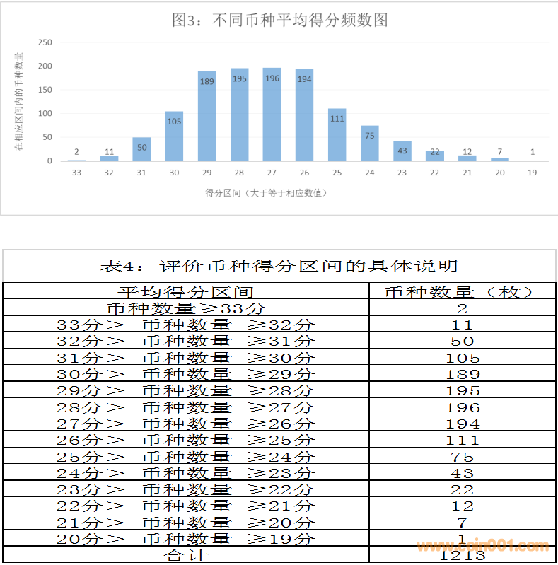 ??????參與評價幣種的得分頻數(shù)分布見圖3和表4。