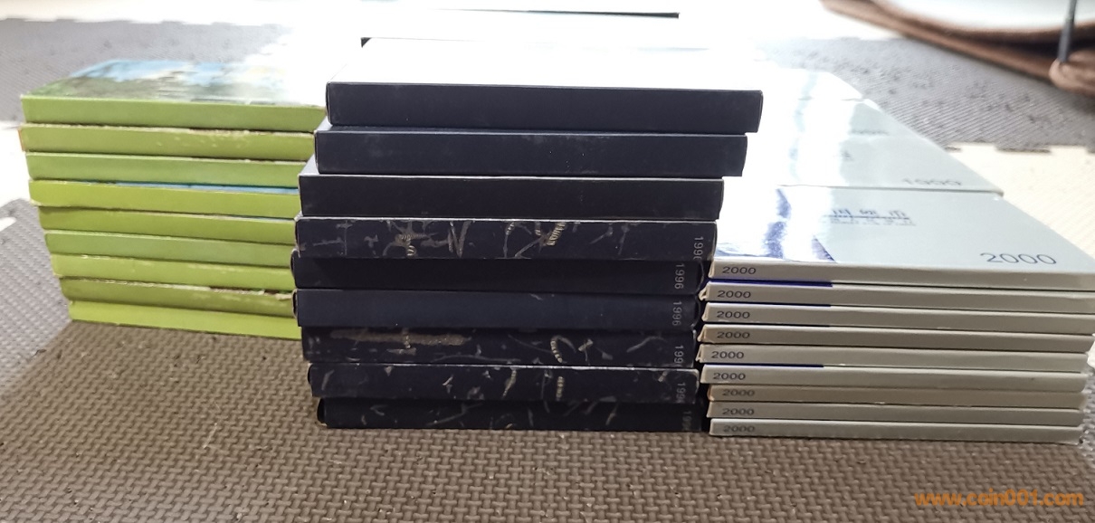 1991-2000年套幣共9套,其中91都是早期貼條版正版(五角為半精制幣,具體如圖),92均為普制幣(92年普制幣少),00套幣為原版非水版貨,都是銀行一手貨,原裝未做任何處理,保存的還不錯,品相都是非常不錯的。因普制幣工藝問題和時間久遠,難免個別幣有氧化、手印等瑕疵,部分套幣盒子也非全品,品嚴者慎拍。