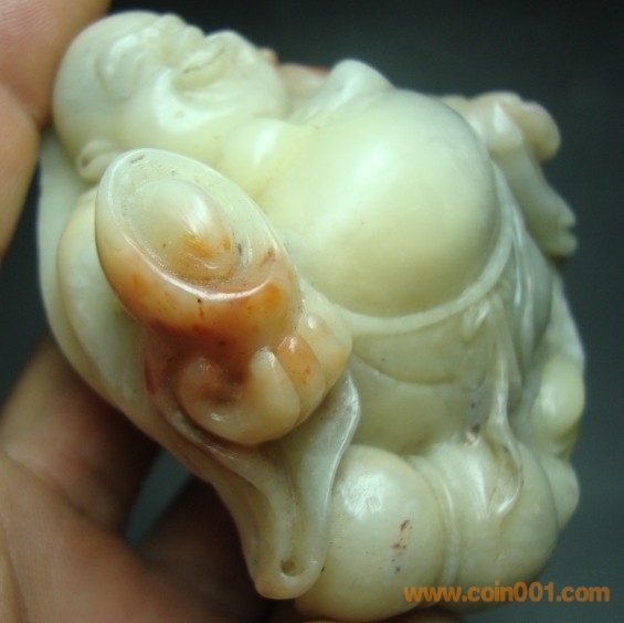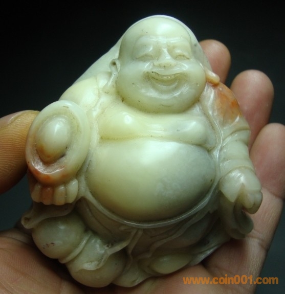 (5) 壽山石之芙蓉石 大肚手持元寶彌勒佛雕件,壽山中的芙蓉石品種,石質(zhì)少,開臉憨態(tài)可掬,手持大元寶,腰寄葫蘆,雕工精巧,石質(zhì)溫潤熟美,適合手中盤玩之物,全品,無缺陷,數(shù)據(jù):高7.3公分,寬度6.6公分,厚度3.5公分左右,包真包正宗壽山石,價格:850元,實在價格,不接大刀;