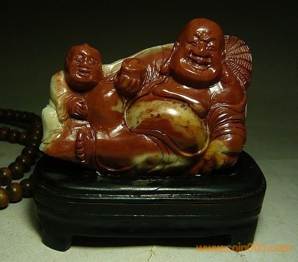 (6)壽山石之高山朱砂 童子戲佛擺件,石性穩(wěn)定,紅巧用得不錯,表情生動俏皮,很不錯的案頭小件,全品,無缺陷,數(shù)據(jù):凈長8.5公分,高7公分,厚3.2公分左右,底座原配贈送,包真包正宗壽山石,價格:950元,實在價格,不接大刀;