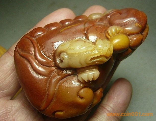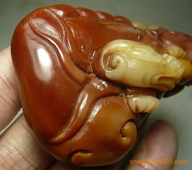 (7)壽山石芙蓉石 巧色蛟龍出海雕件,壽山中的芙蓉石品種,紅黃白三色芙蓉石,石質(zhì)少,質(zhì)地純凈無雜質(zhì),石質(zhì)溫潤,巧色也用得漂亮,全品,無缺陷,數(shù)據(jù):凈長7.3公分,寬4.9公分,厚2.7公分左右,包真包正宗壽山石,價格:650元,實在價格,不接大刀。 要兩件以上的包快遞,單要一件的運費自理,謝謝配合。