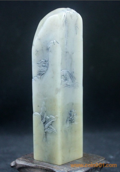 (4)壽山石之白高山石薄意方章《指日高升》,章高11.8公分、章面寬2.7*2.7公分,壽山石白高山質(zhì)地,較少見,周面山水人物薄意,指日高升題材,配木底座及錦盒,全品,無缺陷,包真包正宗壽山石,價格:850元,實在價格,不接大刀;