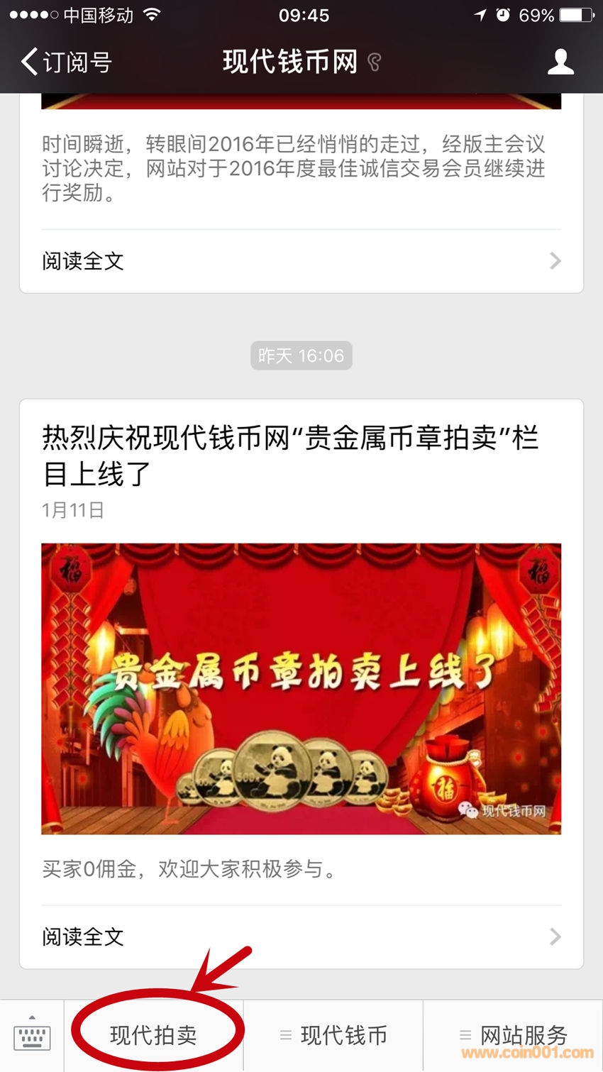 網(wǎng)站微信公眾號,最近增加了新功能,就是將現(xiàn)代拍賣功能移植到網(wǎng)站微信公眾號中。進(jìn)入到網(wǎng)站微信公眾號,點擊左下角“現(xiàn)代拍賣”。