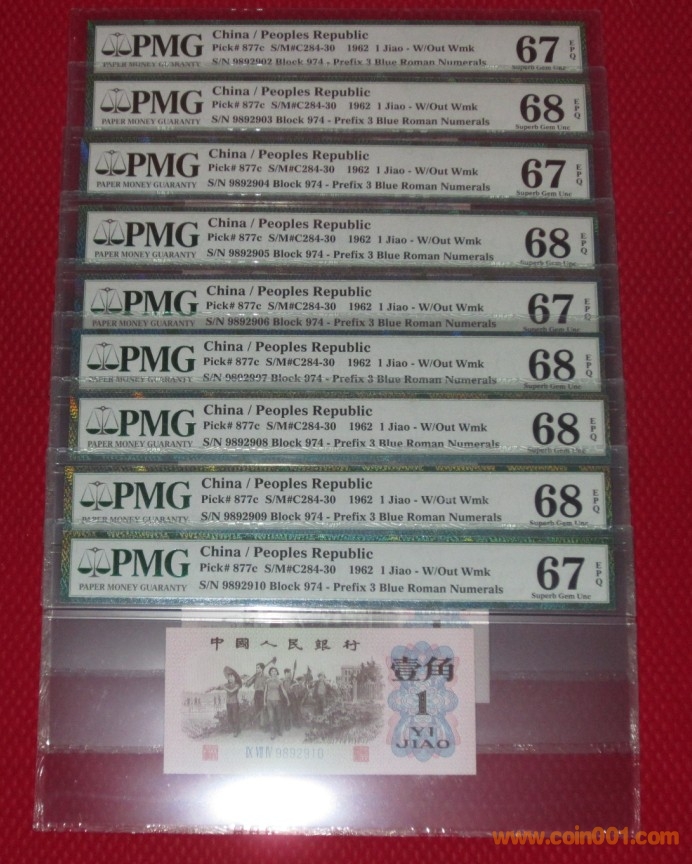 按電話確認藍三羅一角PMG67  9892986、9892987,另外再確認藍二平一角877d  PMG67 尾6、7連號兩枚(不含4)