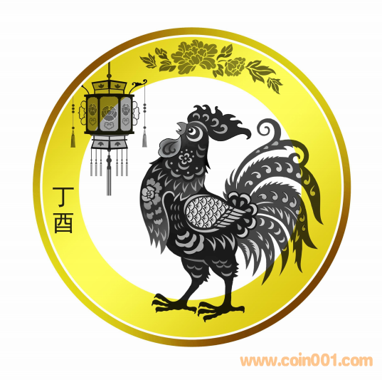 背面主景圖案為一只中國傳統(tǒng)剪紙藝術(shù)與裝飾年畫元素相結(jié)合造型的公雞,其上方為宮燈和牡丹圖案,幣面左側(cè)刊“丁酉”字樣。