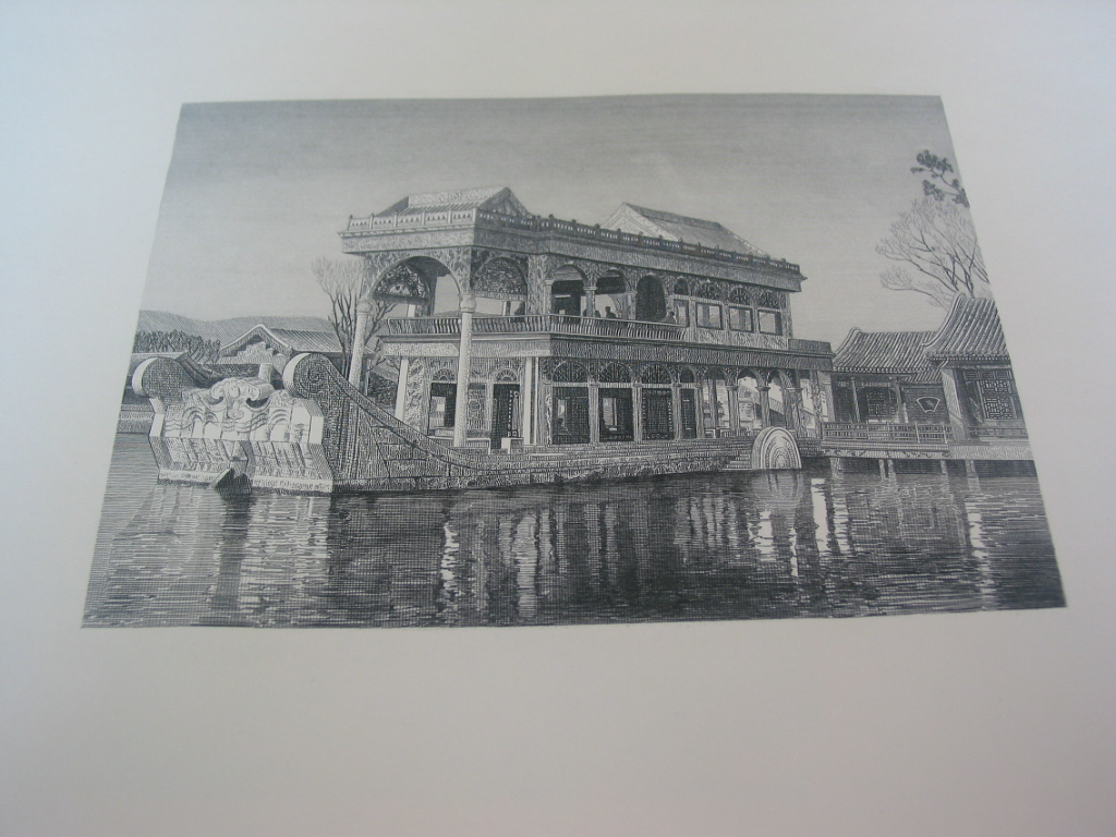 首先,要手工在鋼板上將圖案雕刻上去,這是一項很艱辛的工作。因為鋼的硬度大,所以雕刻的過程非常緩慢,一副鋼板畫需要雕刻師耗費幾個月甚至一年的時間,雕刻的時候只能使用點和線,雕刻師要用這些最簡單的元素創(chuàng)作出最精細(xì)最生動的圖案。如果中途有一筆雕壞,就要從頭來過。
