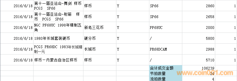 現(xiàn)代錢幣網(wǎng)6月精品拍賣在2016-6-18晚上21:00正式開始,拍品主要涵蓋精制紀(jì)念幣、硬分幣、樣幣、普制紀(jì)念幣、新老三花幣、長城幣、外幣7個(gè)板塊,本次精品拍賣一個(gè)有28項(xiàng)拍品上拍,最終成交24項(xiàng),成交率86%,成交總金額106239元成交。