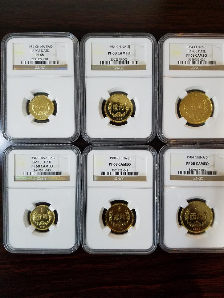 ????近來,本人通過現(xiàn)代網(wǎng)和馬甸市場(chǎng)收藏到一套六枚84年角幣,三枚沈陽版,三枚上海版。由于沈陽版工藝問題,想湊成69分全套幾乎不太可能了,目前擁有68分全套角幣的藏家也絕對(duì)不超過三位。根據(jù)NGC官方數(shù)據(jù),銅鋅合金的長(zhǎng)城角幣高分?jǐn)?shù)量遠(yuǎn)低于銅鎳合金的1元主幣,甚至其氧化程度也比精制千年五角嚴(yán)重。但是從市場(chǎng)表現(xiàn)看,千年精制五角風(fēng)頭蓋過了雙花幣王,但是高分長(zhǎng)城角幣的價(jià)格卻遠(yuǎn)低于主幣,甚至低于高分精制梅花五角。