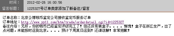心動不如心動,就在農(nóng)歷過年后不久2月1日,聯(lián)系了公博公司,加了它們的QQ客服,流程很簡單,就是:拍照上傳給客服看 ----->  客服確認能評級 ----->  我就寄申通快遞10元到他們公司 ----->  它們2月5日收到幣 ----->  2月6日在天堂網(wǎng)建單 ----->  7枚幣350元評級費+25元回郵 ----->  3月15日收到幣(順豐快遞來的) ----->  結(jié)束。