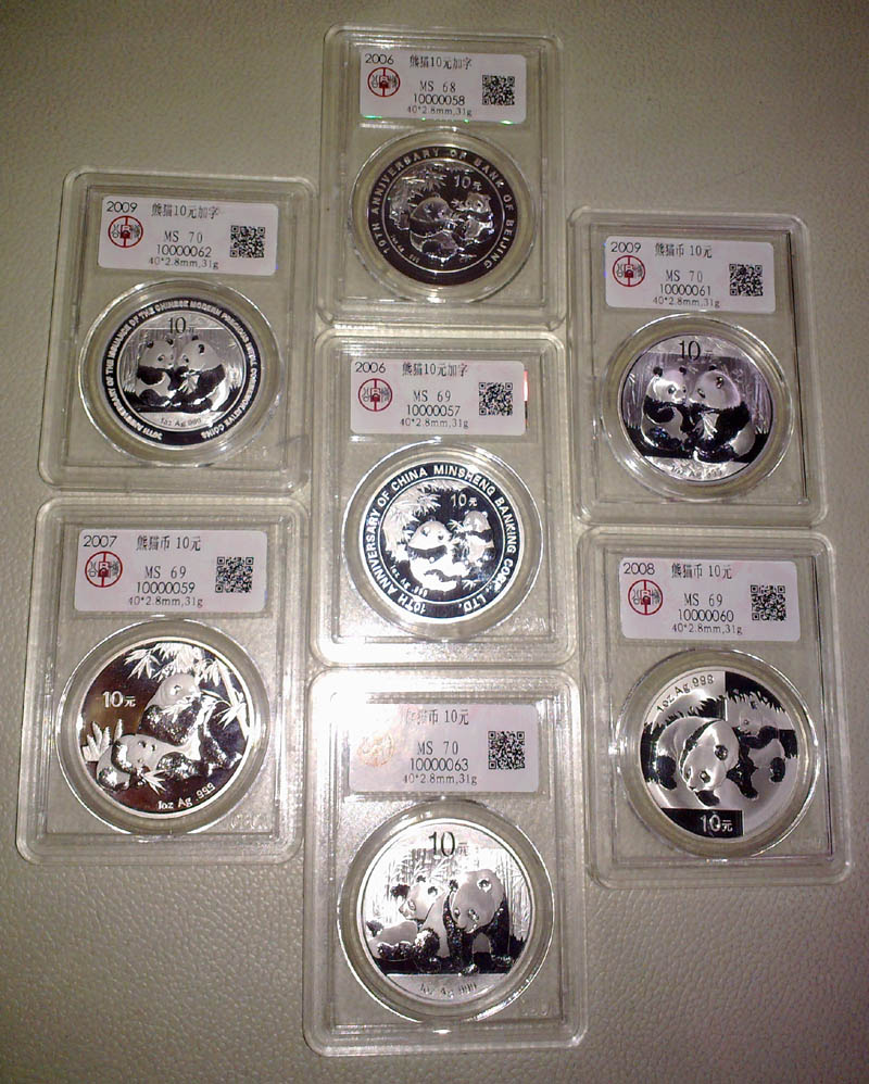 當(dāng)初為何選擇這7枚熊貓幣呢?因為我正為這7枚沒包裝的熊貓幣發(fā)愁,怕保管不好它們,所以才拿去評級。