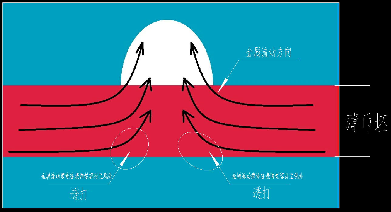 1、由于壓力,產(chǎn)生坯鉼金屬流向模具凹陷處形成幣面的凸出圖紋,金屬流動(dòng)產(chǎn)生流動(dòng)痕跡即鑄紋;
