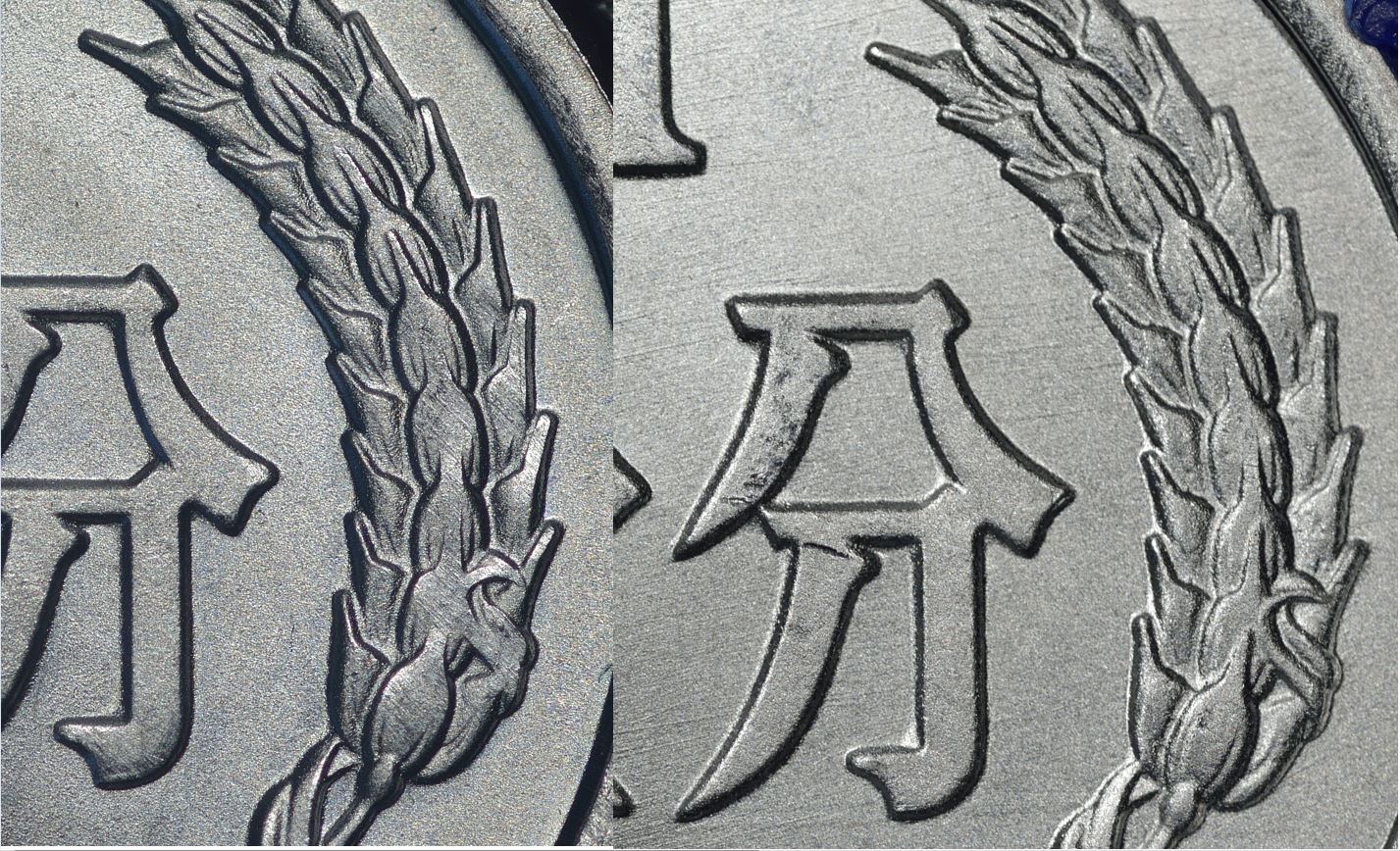 相反,如李兄所說的是模具印壓出來是合理的,模具設(shè)計(jì)時(shí),為脫模方便都會(huì)設(shè)計(jì)成斜坡,精度要求高的,坡度小些,精度要求低的,坡度相對(duì)大些,還有就是模具每使用一些時(shí)間后,表面也會(huì)變粗糙,特別是模具中的凹處會(huì)附上污垢,都要根據(jù)需要定期拋光清理,從這枚幣的邊圈內(nèi)側(cè)斜坡面拆扇般平面的形態(tài)和長(zhǎng)短不一的直線拋光紋,可看出這斜坡應(yīng)是模具壓出來的。