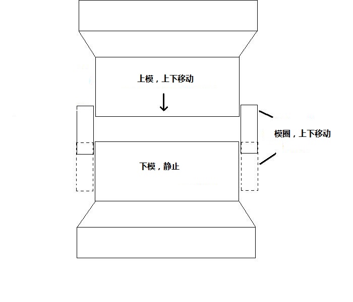 以下兩張圖說(shuō)明了壓印時(shí)各個(gè)模具的位置和動(dòng)作。一張我翻譯的,一張取自新浪博客上那個(gè)東拉西扯的帖子。這里用的是升降式模圈。