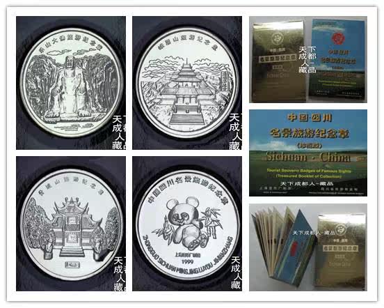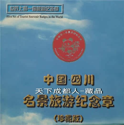 世界上第一套旅游紀念套章:1999年四川省旅游局監(jiān)制、上海造幣廠精工鑄造發(fā)行《中國四川名景旅游精制紀念套章珍藏冊》原外封套冊證全套18枚章;各章材質(zhì)純銅鍍銀、手雕精制帶齒邊工藝、各章直徑36毫米、厚度2毫米,限量1.5萬套(鑄造完畢即公開絕版);上幣原金色外紙?zhí)變?nèi)冊鑲嵌各章精美裝幀,隨附帶編號鑒定證書1張,以資紀念。 此冊裝幀各旅游套章以四川省國家級、世界級旅游風景區(qū)為題材,取其著名景點,精心手工繪圖,精工制作的一套系列紀念章。全套鍍銀紀念章由九寨溝、樂山大佛、峨嵋山等12個風景區(qū)的精選圖片、配置中英文字簡介、簡略導游圖;背面圖案統(tǒng)一刊“中國四川名景旅游紀念章、上海造幣廠”中英文字樣,刊年號及四川旅游局會徽裝幀成冊。