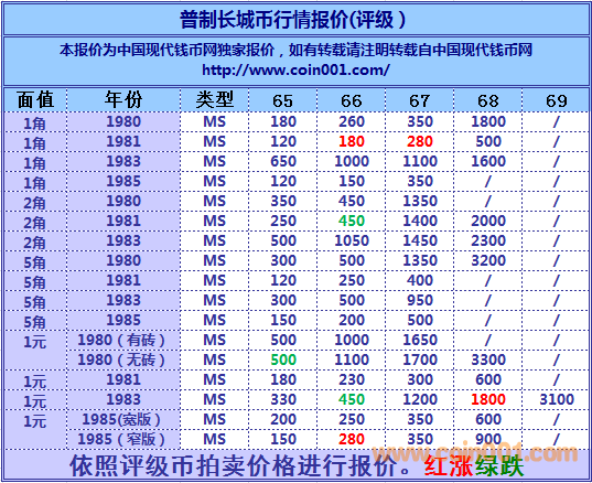 2016,9,1普制長城幣報價 ..