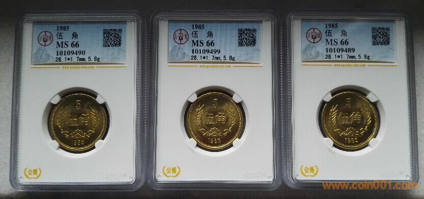 本人手中的1600多枚1985年5角長城公博評級幣,是在原件件貨中精挑細選出來自己留存的,經(jīng)過公博公司權(quán)威評級,全部為MS66分。1985年5角長城評級幣,67分以上的高分幣非常稀少,NGC近些年來也只評出幾十枚67分的,可見好品幣甚為難得。